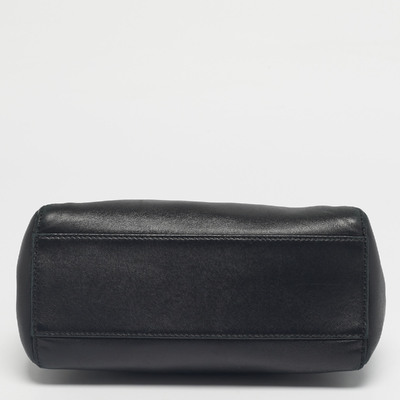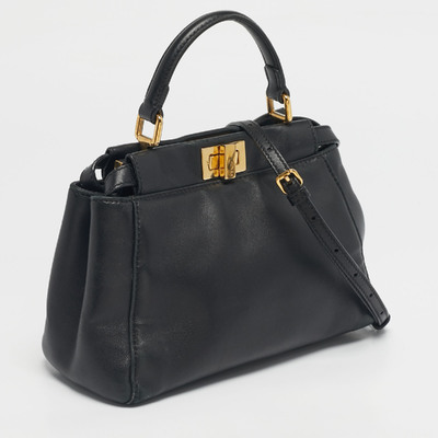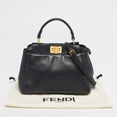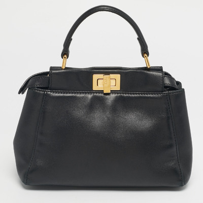 This Mini Peekaboo is a compact Fendi icon, crafted in smooth black leather with the signature twist lock closure. The structured body, top handle, and gold tone metal details come together in a design that is simply timeless.