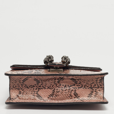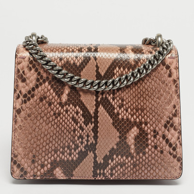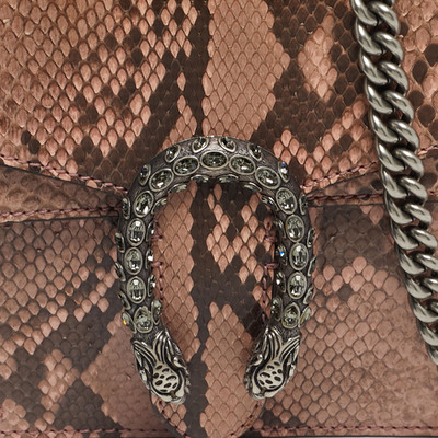This preloved Gucci Dionysus shoulder bag shines in pink python with crystal embellishments on the iconic tiger head clasp. The compact silhouette and chain strap make it ideal for evening wear, offering just the right mix of glamour and signature edge.