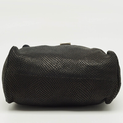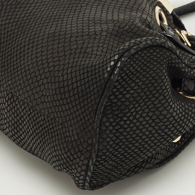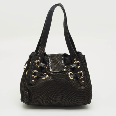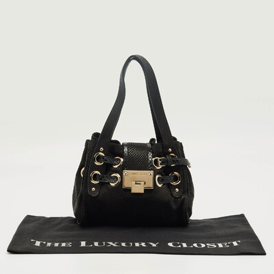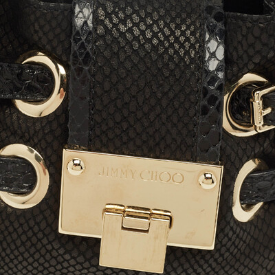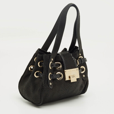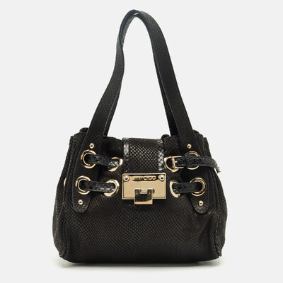 This Jimmy Choo Mini Riki tote is made from black snakeskin embossed leather, featuring dual handles and buckle detailing. The compact form and glossy texture make it a chic accessory for day or night. A sophisticated expression of modern glamour.