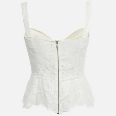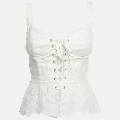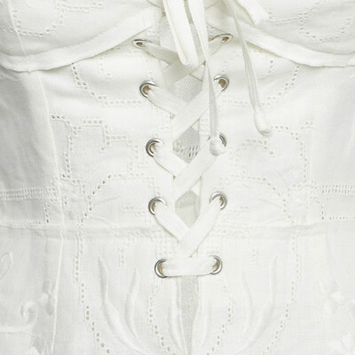 Dolce and Gabbana’s corset is crafted from a white linen blend, enhanced with intricate embroidery and a lace up front. The fitted structure highlights the waist while maintaining delicate femininity. A statement design that captures the maison’s romantic Italian sensibility.