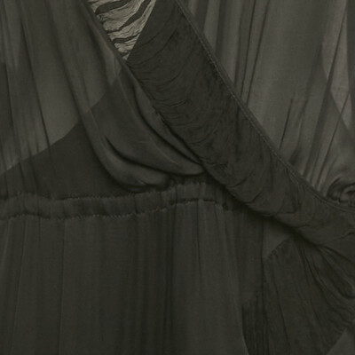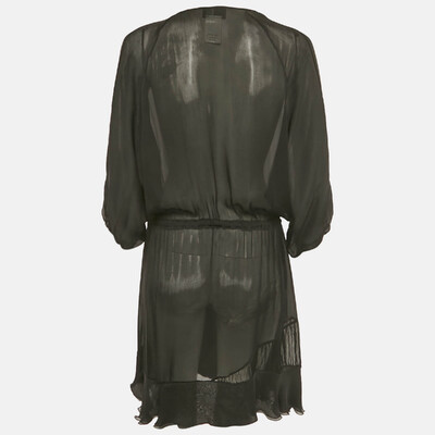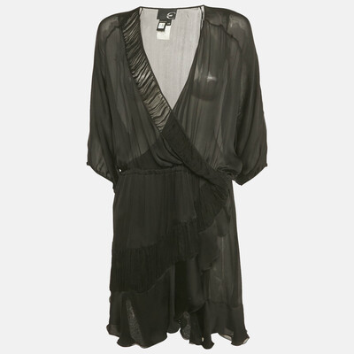 Just Cavalli’s black silk mini dress has a see through design with a V neckline and easy fit. Short sleeves and a ruffled skirt give the dress soft, flowing movement.