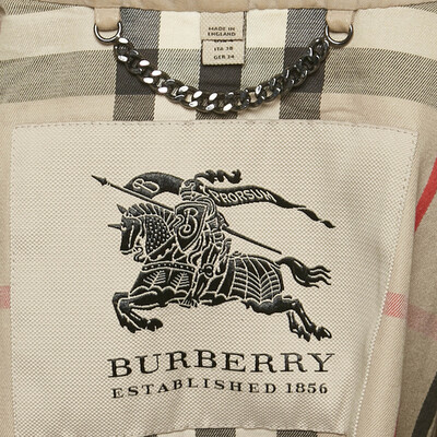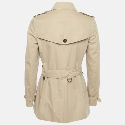 Burberry’s beige short trench coat is made from cotton and features shoulder epaulets, a gun flap, and belted cuffs. The waist tie gives shape, making it a timeless and versatile piece for everyday wear.