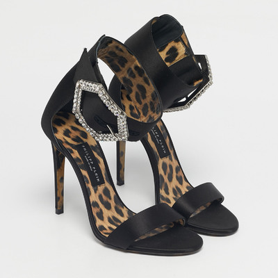 These Philipp Plein sandals are crafted from black satin. They feature a wide strap finished with a crystal encrusted buckle that adds just the right amount of shine. Set on a high heel, they are made for occasions that call for presence without excess.