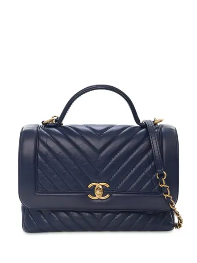 This satchel features a quilted leather body, a flat top handle, a leather woven chain strap with leather shoulder guard, a front flap with CC turn-lock closure, an exterior back slip pocket, and interior zip and slip pockets. Blue. Serial Number: 24836933. Inclusions: dust bag, authenticity card. Condition: EXCELLENT. This previously owned item is in near-perfect condition with no signs of damage or use. Due to the exclusivity of this item and its limited availability, processing and delivery might take longer than usual. Please refer to the photos on this product page for a detailed view of the item, including any damages declared.