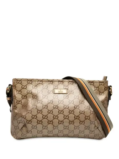coated canvas body adjustable flat canvas web strap top zip closure interior zip and slip pockets.Brown.Serial Number: 189749 001998.This item has no inclusions.Condition: GOOD. This previously owned and used item is in good condition with minimal signs of use. This may include fading of material or plating and scratches.Please refer to the photos on this product page for a detailed view of the item including any damages declared