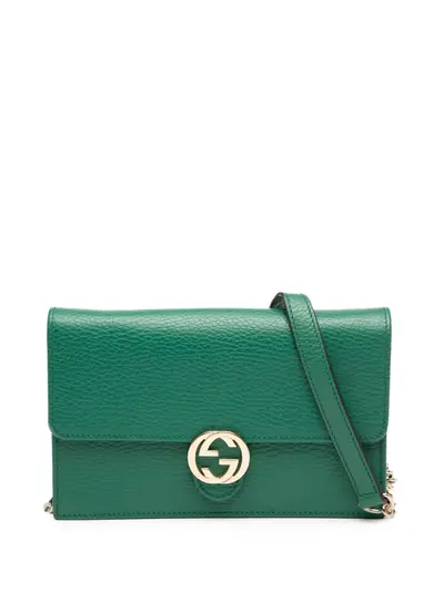 This wallet on chain features a leather body, a curb chain strap with leather guard, a flap with magnetic button closure, an interior zip compartment, and interior slip pockets. Green. Serial Number: 615523 493075. This item has no inclusions. Condition: EXCELLENT. This previously owned item is in near-perfect condition with no signs of damage or use. Please refer to the photos on this product page for a detailed view of the item, including any damages declared.