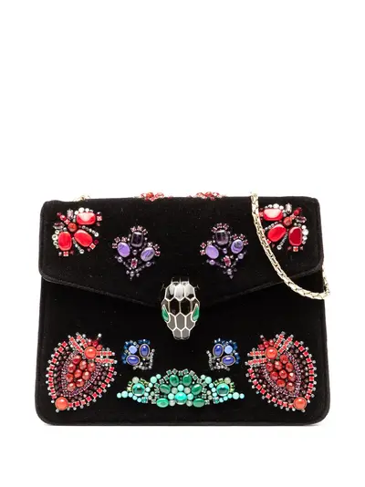 velvet body with jewel embellishments chain link shoulder strap front flap with a snap button closure interior slip pocket.Black.Inclusions: mirror.Condition: EXCELLENT. This previously owned item is in near-perfect condition with no signs of damage or use.Due to the exclusivity of this item and its limited availability processing and delivery might take longer than usual.Please refer to the photos on this product page for a detailed view of the item including any damages declared