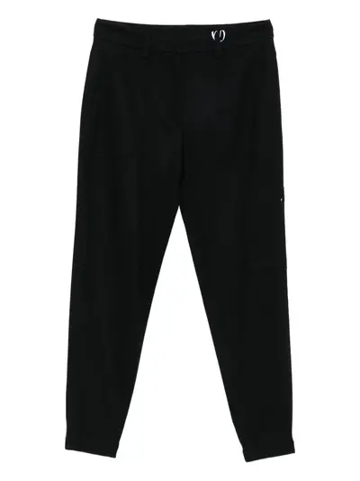 black side pockets back pockets elasticated hems belt loops concealed front fastening
