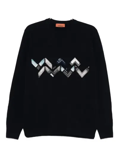 navy blue wool zigzag detail knitted construction round neck long sleeves ribbed hem The item you receive may differ slightly from the item photographed. This is due to the artisanal nature with which all Missoni products are constructed.