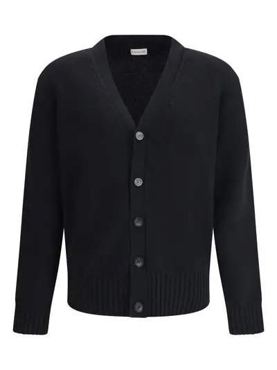 black V-neck button fastening long sleeves ribbed hem logo patch at the sleeve