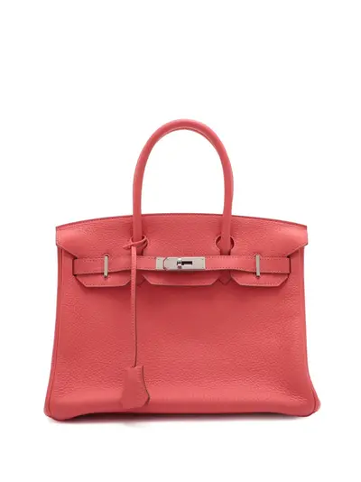 The Birkin 30 features a Clemence leather body in Rouge Pivoine color, rolled leather handles, a flap with pull-through and turn lock closure, and interior zip and slip pockets. Red. Serial Number: □R. Inclusions: padlock, key, charm. Condition: EXCELLENT. This previously owned item is in near-perfect condition with no signs of damage or use. Due to the exclusivity of this item and its limited availability, processing and delivery might take longer than usual. Please refer to the photos on this product page for a detailed view of the item, including any damages declared.