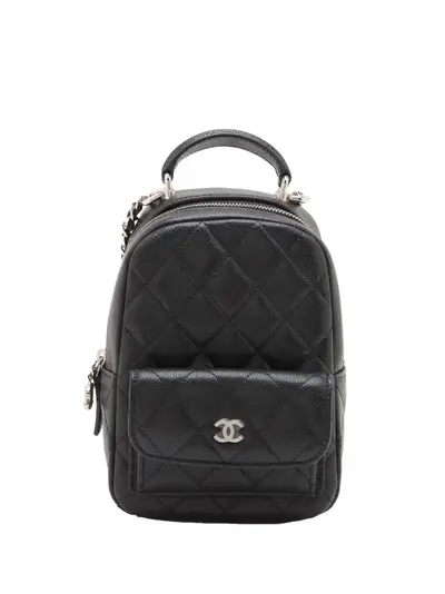 This backpack features a quilted caviar leather body, a rolled top handle, detachable leather woven chain straps, a top zip closure, an exterior flap pocket with magnetic snap closure, and interior slip pockets. Black. Serial Number: L0LGKK9L. This item has no inclusions. Condition: EXCELLENT. This previously owned item is in near-perfect condition with no signs of damage or use. Due to the exclusivity of this item and its limited availability, processing and delivery might take longer than usual. Please refer to the photos on this product page for a detailed view of the item, including any damages declared.