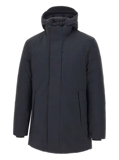 blue removable hood concealed zip closure elasticated cuffs zipped side pockets vertical chest pocket rubberised logo