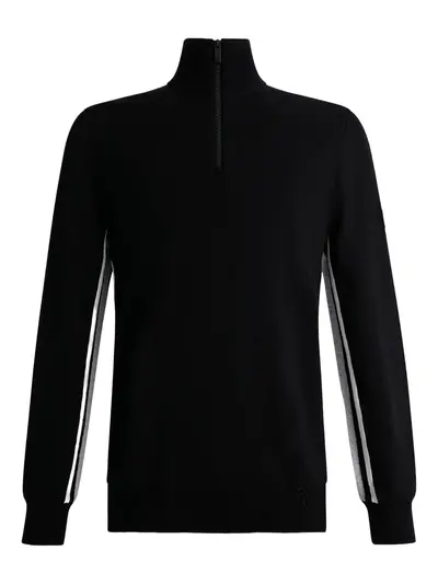 black jersey knit intarsia stripe detail high neck half-zip fastening logo patch