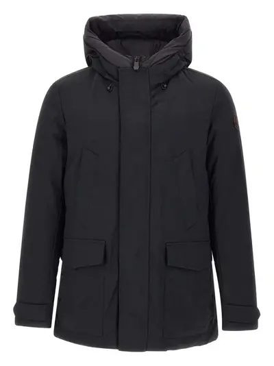 black padded drawstring hood front flap pockets buttoned handwarmer pockets button-adjustable cuffs logo on the left sleeve