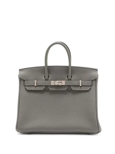 The Birkin 25 features a togo leather body in Gris Meyer color, rolled leather handles, a front flap with turn-lock closure, and interior slip and zip pockets. Gray. This item has no inclusions. Condition: EXCELLENT. This previously owned item is in near-perfect condition with no signs of damage or use. Due to the exclusivity of this item and its limited availability, processing and delivery might take longer than usual. Please refer to the photos on this product page for a detailed view of the item, including any damages declared.