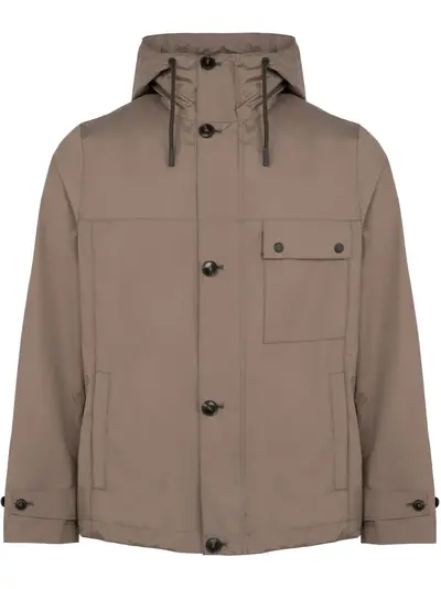 beige front button and zip fastening chest flap pocket two side welt pockets drawstring hood