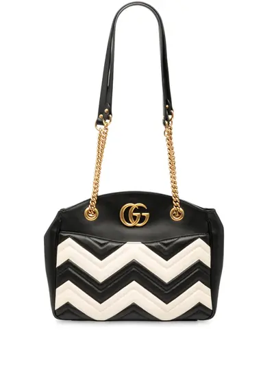 This shoulder bag features a quilted leather body, curb chain straps, an open top with a magnetic closure, an exterior slip pocket, and interior zip and slip pockets. Black. Serial Number: 443501 493075. This item has no inclusions. Condition: EXCELLENT. This previously owned item is in near-perfect condition with no signs of damage or use. Due to the exclusivity of this item and its limited availability, processing and delivery might take longer than usual. Please refer to the photos on this product page for a detailed view of the item, including any damages declared.