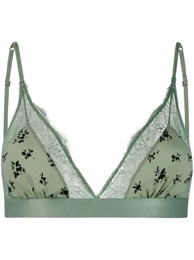 Mint and black printed bra from love stories featuring adjustable shoulder straps, a soft cup style, a floral print, a hook fastening and lace trims. Underwear and lingerie must be tried on over your own garments.