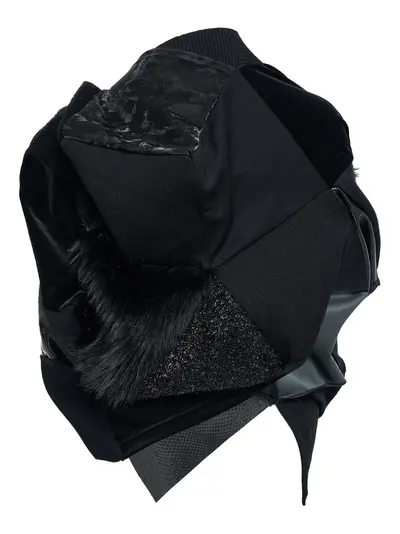 black patchwork design high neck fur panel velvet panel leather panel ribbed knit panel sequin panel