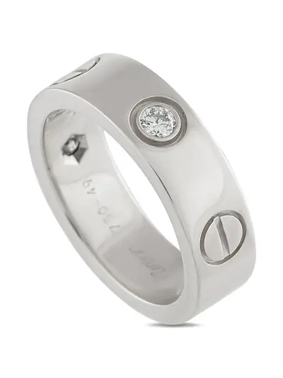 silver-tone 18k white gold bezel-set round-cut diamonds three diamonds signature circle motif 6 mm width 2 mm top height Your purchase will arrive with a gift box. Normal everyday use and external agents may reduce the lustre of gemstones and gold surfaces. To maintain, use specific, non-abrasive products specially meant for cleaning jewellery. Condition: EXCELLENT. This previously owned item is in near-perfect condition with no signs of damage or use.