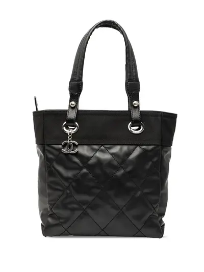 This tote bag features a quilted coated canvas body with nylon trim, flat top handles, a top zip closure, and an interior zip pocket. Black. Serial Number: 14459728. Inclusions: charm. Condition: GOOD. This previously owned and used item is in good condition with minimal signs of use. This may include fading of material or plating and scratches. Due to the exclusivity of this item and its limited availability, processing and delivery might take longer than usual. Please refer to the photos on this product page for a detailed view of the item, including any damages declared.