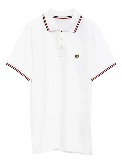 white cotton piquet tricolor-knit collar tricolor-knit cuffs button closure logo patch