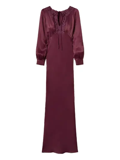 burgundy satin fabric lace neckline insert long sleeves fitted bodice