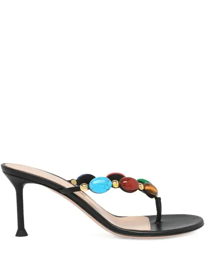 black calf leather cabochon gemstone open toe thong strap branded leather insole high heel