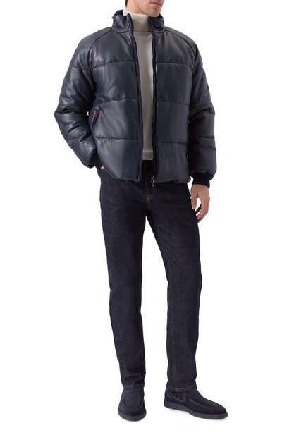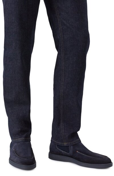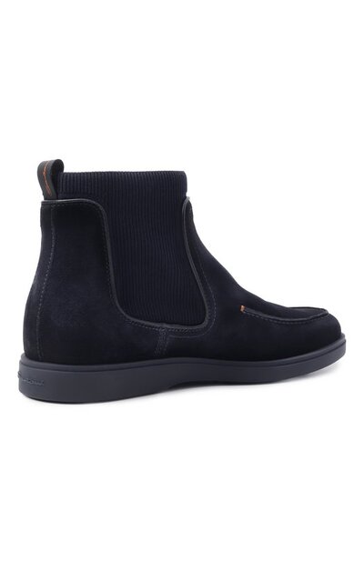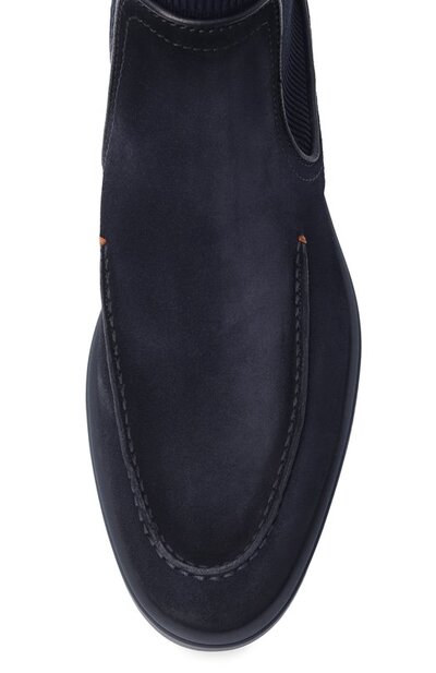 Челси с рельефным швом на союзке выполнили из замши. Голенище с рифленой трикотажной вставкой и узким глянцевым кантом дополнили петлей с логотипом в тон стежкам фирменного оранжевого оттенка по бокам.