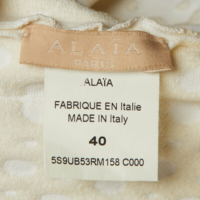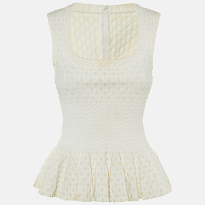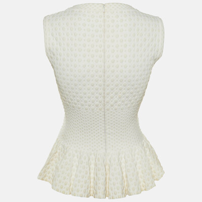 This Alaïa ivory top in dotted jacquard knit features a sleeveless design with a wide scoop neckline. The dotted texture adds interest, while the peplum shape brings a gentle, flattering movement, making it easy to pair with skirts or tailored pants.