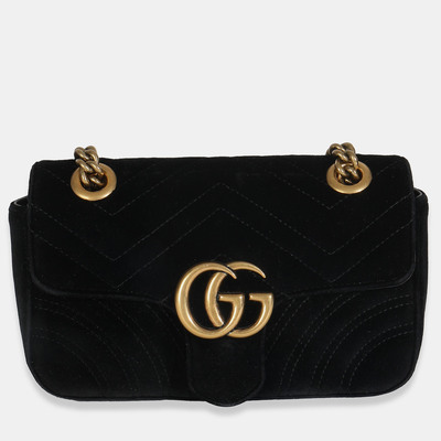 This Gucci Mini GG Marmont Bag is made from plush black matelassé velvet with antique gold Double G hardware. The flap front and chain strap make it a compact choice for evening or everyday wear.