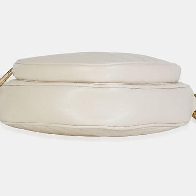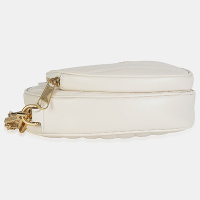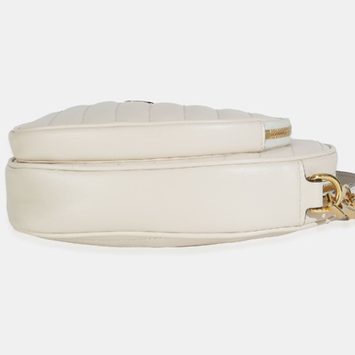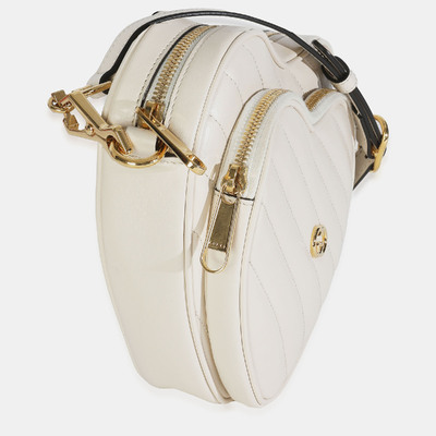Crafted from Mystic White matelassé calfskin, this Gucci Mini Interlocking G Heart Bag features diagonal stitching and the signature heart detail on the back. Its compact size and chain strap make it an easy piece for day or night wear.