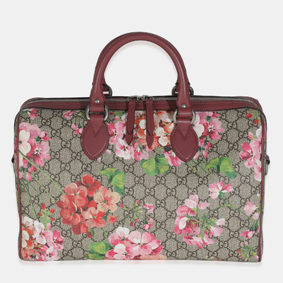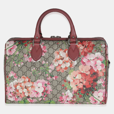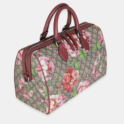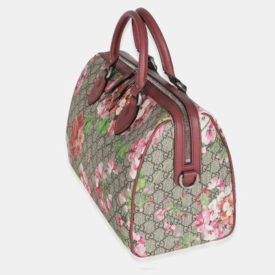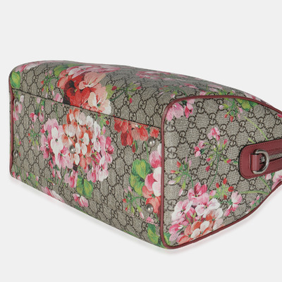 This Gucci Large Boston Bag showcases beige GG Supreme canvas with the multicolor Dry Rose Blooms print and light leather trim. The structured duffle style shape features a zip closure and rolled top handles for versatile use.