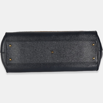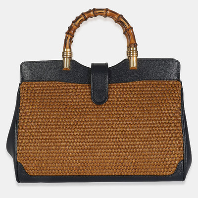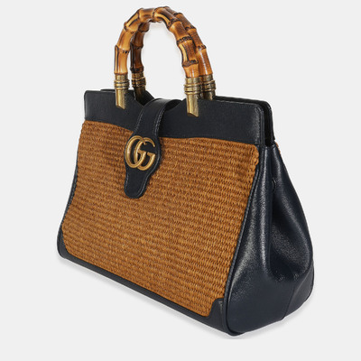 This Gucci Medium Dahlia Bamboo Bag blends dark natural straw with blue calfskin leather trim and bamboo handles. The structured design features gold tone hardware and an adjustable shoulder strap for versatile styling.