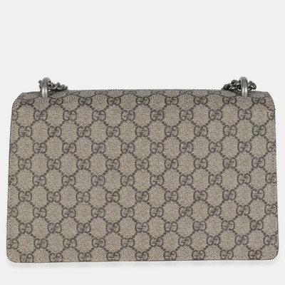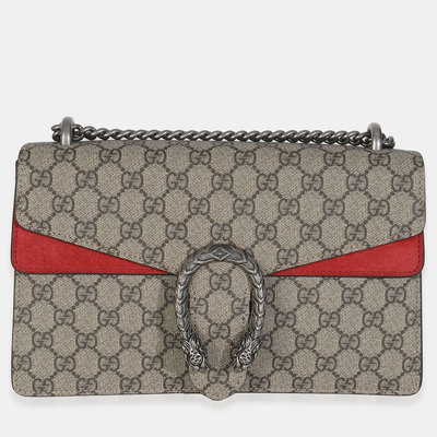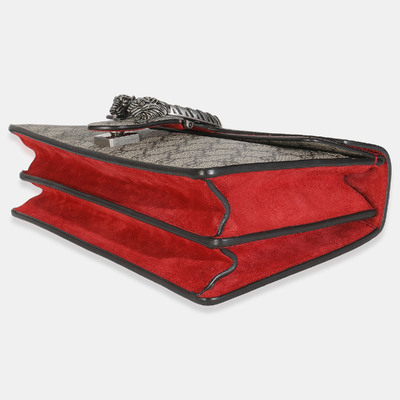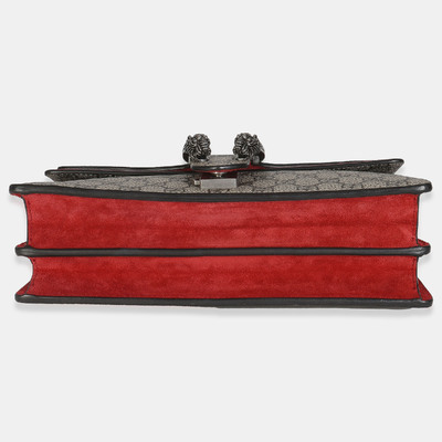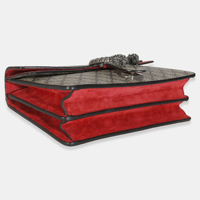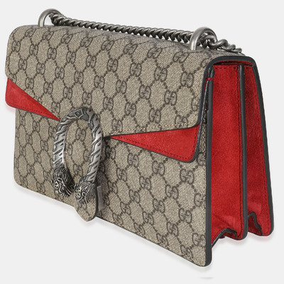 The Gucci Medium Dionysus Shoulder Bag is made from red and beige GG Supreme canvas with suede details and the signature textured tiger head closure. The sliding chain strap allows for shoulder or crossbody wear.