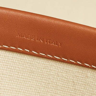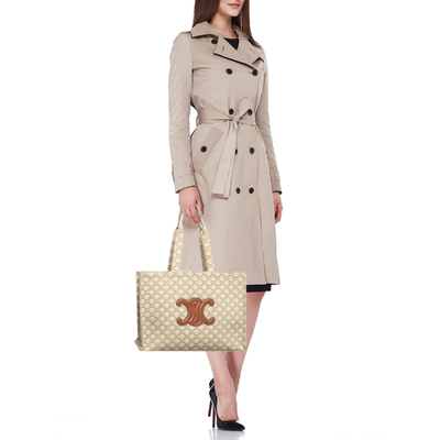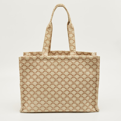 The Celine Large Cabas Thais Tote in beige and brown Triomphe canvas offers a spacious interior perfect for daily essentials and more. Its canvas body and handles make it easy to carry from office meetings to weekend errands.