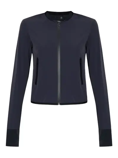dark blue stand collar zip front fastening long sleeves welt pockets elasticated cuffs