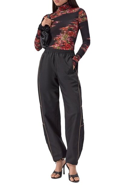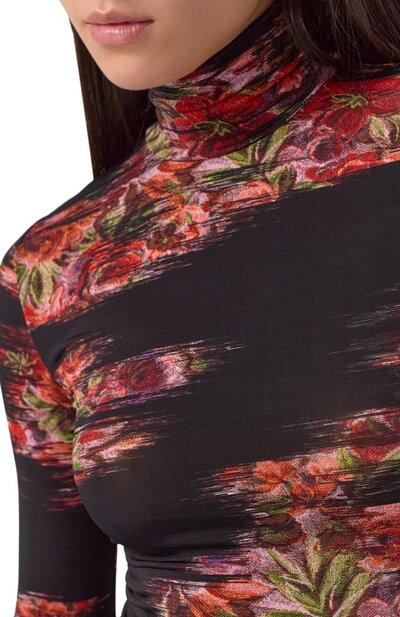 Для пошива облегающего топа использовали вискозное джерси с цветочным принтом. Эластичная модель с высоким воротником удачно дополнит повседневный гардероб.