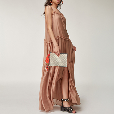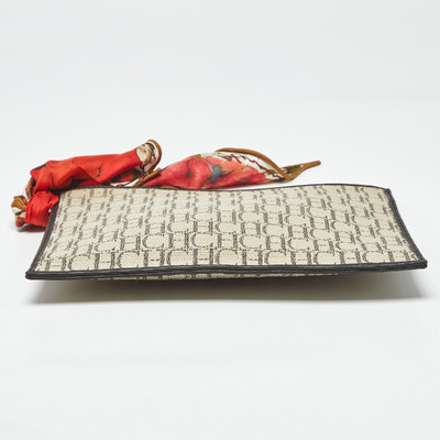 The CH Carolina Herrera continental pouch slides easily into a larger bag or carries on its own. Beige and brown monogram canvas gives it texture, and a printed scarf charm adds a touch of character. The zipper keeps essentials secure, while its slim shape holds only what you reach for most.
