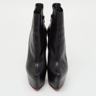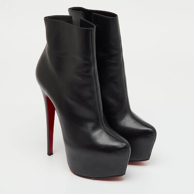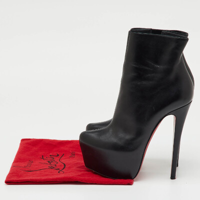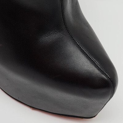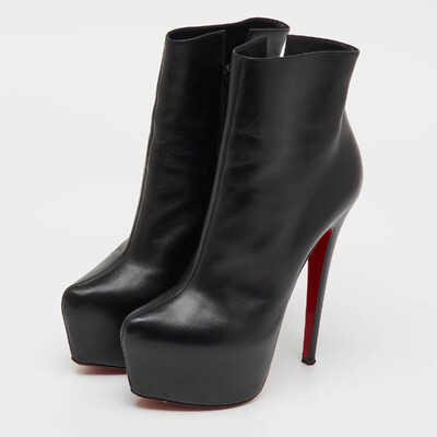 The Lady Daf boots elevate instantly with a daring 15.5 cm stiletto heel, giving the silhouette a commanding stance. The ankle length design hugs the leg, while the platform balances the height effortlessly. Red lacquered soles add signature drama, and black leather gives the boots a sleek, sculptural presence.