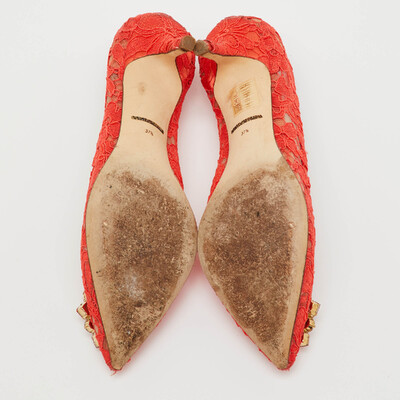Every detail of these Dolce and Gabbana Bellucci pumps speaks of craftsmanship and audacity. Fiery orange lace wraps the foot, while a cluster of crystals on the pointed toe adds a striking flourish. With stiletto heels, they shine in evenings that call for color, sparkle, and unmistakable presence.