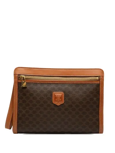 This clutch bag features a coated canvas body with leather trim, a flat leather wrist strap, a top zip closure, exterior front zip and back slip pockets, and an interior zip pocket. Brown. Serial Number: MC96. This item has no inclusions. Condition: GOOD. This previously owned and used item is in good condition with minimal signs of use. This may include fading of material or plating and scratches. Please refer to the photos on this product page for a detailed view of the item, including any damages declared.
