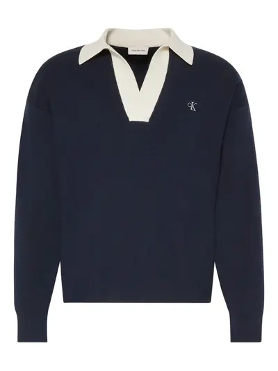 navy blue logo detail collared neck long sleeves ribbed cuffs and hem