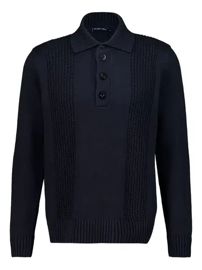 navy blue ribbed knit button fastening long sleeves polo collar straight hem