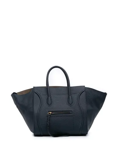 The Phantom Luggage Tote bag features a leather body, rolled leather handles, an open top, and interior and exterior zip pockets. Blue. Serial Number: S-LA-4124. Inclusions: dust bag. Condition: GOOD. This previously owned and used item is in good condition with minimal signs of use. This may include fading of material or plating and scratches. Declared Damages: Handle/Strap Feature(s) Minor Peeling. Please refer to the photos on this product page for a detailed view of the item, including any damages declared.