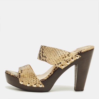 The Jimmy Choo platform sandals are crafted from beige and brown snakeskin embossed leather, set on a smooth, sculpted base. Broad straps hold the foot comfortably, and the high platform brings an easy sense of height. They work beautifully with neutral tones or flowing silhouettes.