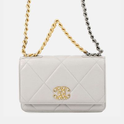 The Chanel 19 Chain Wallet in gray lambskin combines soft leather with signature diamond quilting and metal hardware. Compact and versatile, it includes card slots and a removable chain strap.