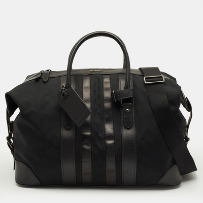 Ralph Lauren’s duffel bag combines black leather with striped nylon panels, uniting function with visual appeal. Spacious and durable, it features sturdy handles and ample storage for travel or gym use, maintaining a polished look through every journey.