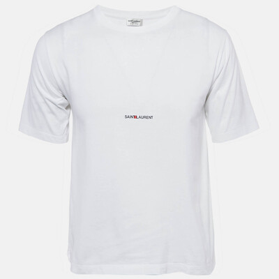 Saint Laurent’s T shirt in white cotton features a clean logo print across the chest. The half sleeve design and soft finish bring ease and versatility, making it a refined addition to casual wardrobes.